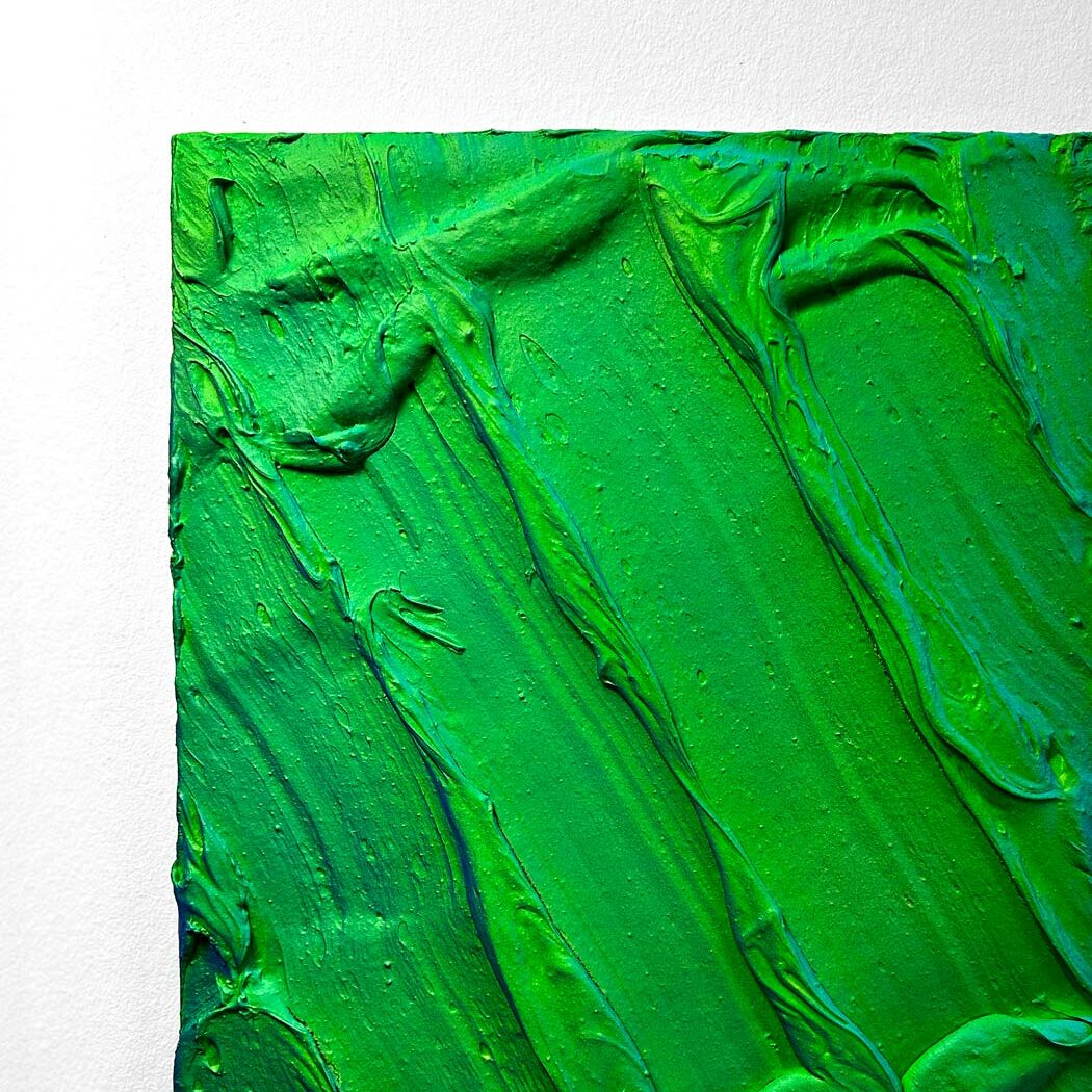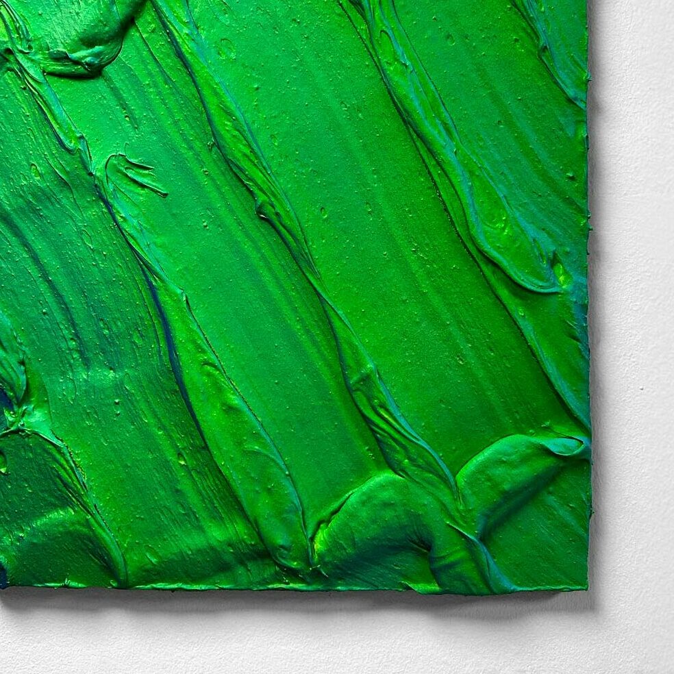 Physically, my artworks come to life on poplar wood panels that undergo repeated cycles of treatment with varnishes. Then, pastes are created by mixing various chemical and natural elements, such as rock fragments, fillers, adhesive gels, and other materials. These pastes are shaped and worked to form the compositions, which are then spray-painted with acrylic colors. Finally, each piece is finished with epoxy resin, which gives it extraordinary chromatic depth and durability.